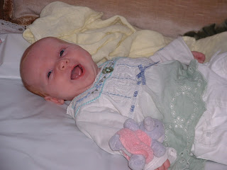 My favourite photo of Naomi so far - looking angelic... Now there are two sides to Naomi's personality the one you see here and the one where she exercises her lungs from around 6:30 to 11:30 pm!! Someone kindly pointed out to me today that I would have more energy to deal with this if I was a younger Mum. So I would - but hey, can't change that...